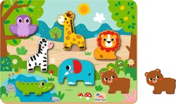 Aký to krásny pohodový deň. Slniečko svieti a väčšina zvieratiek vyšla zo svojich domovov. Toto vkladacie puzzle prináša skvelú možnosť, ako u našich najmenších trénovať jemnú motoriku, trpezlivosť a spoznávanie zvieratiek. Skladá sa zo základne a 7 odnímateľných dielikov. Hračka je vyrobená z kvalitného FSC dreva. Má krásne ilustrácie, vďaka ktorým môže tiež poslúžiť ako milá dekorácia v detskej izbičke.