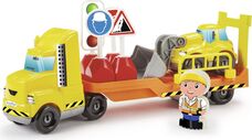 Stavebný kamión s bagrom pozýva batoľatá na hračkárske ihrisko v detskej izbe! Veľké žlté auto so spúšťacou rampou môže prepravovať dopravné značky a bager s pohyblivou lyžicou. Figúrka stavebného robotníka nabáda k hre na roly.