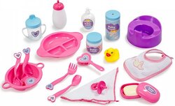 Starajte sa o svoju bábiku s touto rozkošnou 20 dielnou sadou ADDO z radu Be My Baby. Zaistite, aby bola vaša bábika čistá, umyte ju, dajte ju na nočník a namažte krémom. Potom ju učešte vlásky a pripravte niečo dobré na večeru.Sada obsahuje: 1x nočník, 1x kačička, 1x fľašu mlieka, 1x netečúci hrnček, 1x detské mlieko, 1x detský krém, 1x detský zásyp, 1x dvojdielna krabička na mydlo, 1x plastové mydlo, 1x m 1x podbradník, 2x miska na jedlo, 2x vidlička, 2x lyžica.