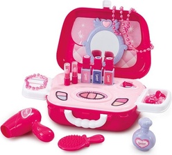 Pripravme sa na deň s dokonalým kozmetickým setom. Noste toto robustné ružové puzdro za rukoväť alebo ho noste so štýlovým remienkom na telo a potom ho otvorte a odkryte všetky jeho rozkošné doplnky.Pomocou predstieraného make-upu môžete hrať, že nanášate očné tiene, rúže a lícenky. Vysušte a vykefujte si vlasy, nasaďte si náhrdelník, náramok a navlečte prstene. Potom svoj vzhľad zakončite parfémom.