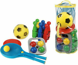 - Obsahuje: mäkkú loptu priemer 20 cm, sadu na lenivý tenis s loptičkou (veľkosť rakety 54 cm, priemer 21 cm), petanque, lietajúci tanier priemer 22 cm a sadu 6 kolkov s dvoma loptičkami.
