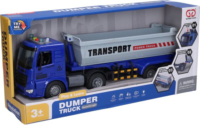 • Vydáva svetelné a zvukové efekty. Aktivácia tlačidlami na streche. Tlačidlo 1 - zvuk motora, zvuk sklápania. Tlačidlo 2 - zvuk cúvania, zvuk trúbenia. Batéria 3xAG13, súčasťou (1,5V). Otvárateľné dvere, sklápacia korba, na zotrvačník. Náves je možné odpojiť.