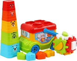 Tento multifunkčný triediaci autobus umožňuje deťom triediť figúrky zvierat, hrať sa s kockami a geometrickými tvarmi, stavať pyramídu a prepravovať svoje obľúbené hračky.