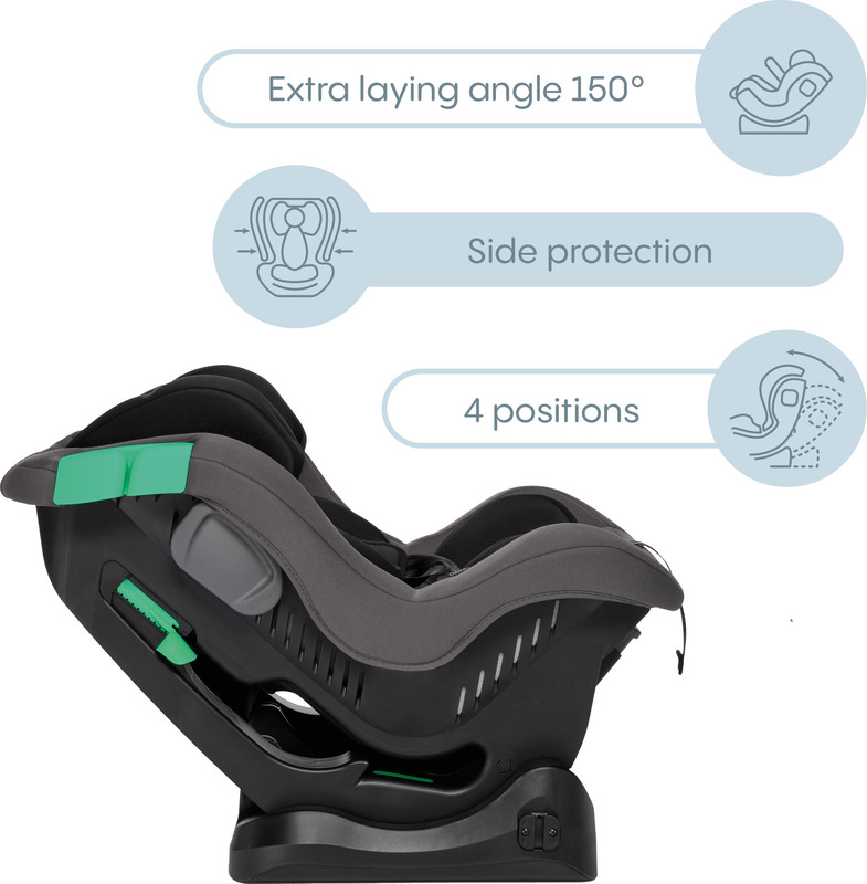 • Extra ležiaca poloha v protismere jazdy (uhol 150°) efektívne zmierňuje sily pôsobiace na dieťa v prípade núdzového brzdenia alebo nárazu