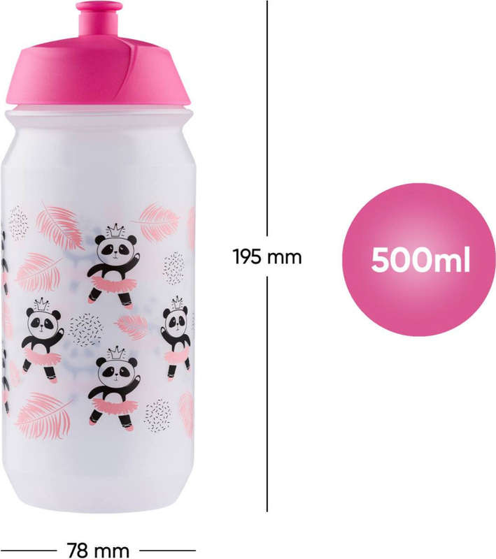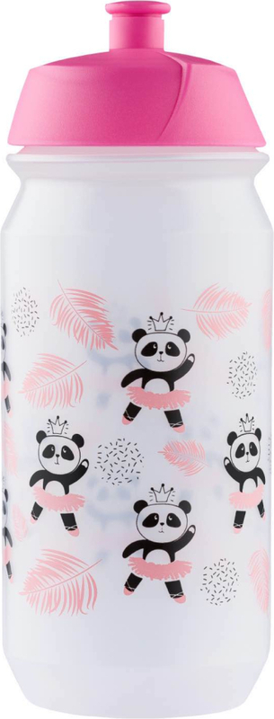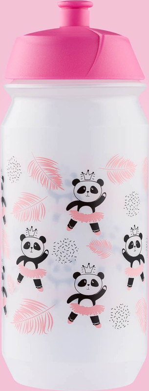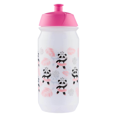 Priehľadná detská fľaša na nápoje s obrázkom pánd a ružovým náustkom.