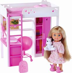 Bábika Evička s vysokou posteľou, pracovným stolom, šatníkovou skriňou a ďalším príslušenstvom.