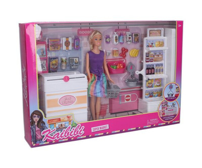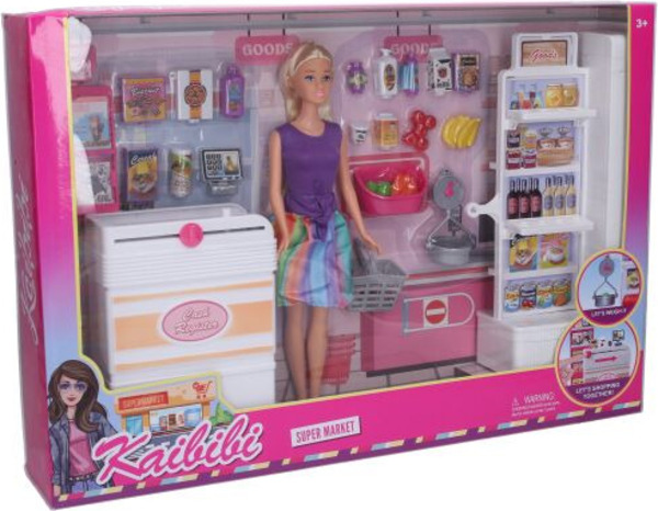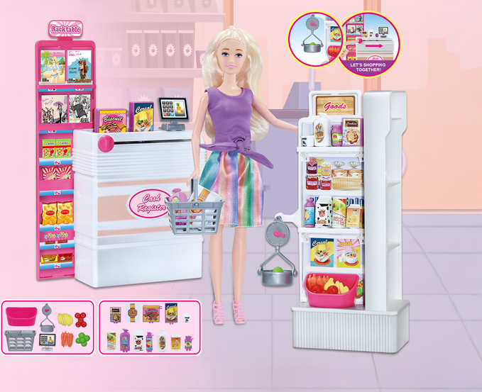 - Obsah balenia: bábika, regál na tovar, potraviny a tovar, pokladňa s pásom, nákupný košík a ďalšie doplnky