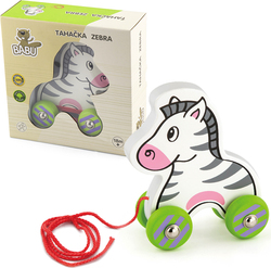 Drevené hračky pre najmenších. Ťahacia zebra na povrázku. Dieťa ťahá hračku zebry za povrázok, hračka má kolieska, na ktorých ide. Klasické hračky z dreva s novým designom.