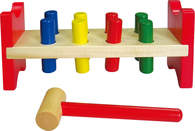 - Farebná drevená hračka obsahuje doštičku, farebné kolíky na zatĺkanie a drevené kladivko.