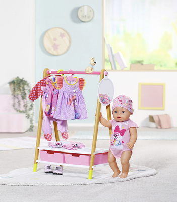 Psík Bello teraz pracuje pre módnu políciu. Z najvyššieho bodu stojanu na oblečenie doma stráži všetku módu pre BABY born a ostražito pozoruje nové modely. V zrkadle, ktoré možno zložiť, si môže malá parádnica prezrieť svoje outfity na sebe. Stojan na oblečenie v škandinávskom štýle má vzpery vo vzhľade dreva. Na ružovom priečnika sú zavesené tri farebné ramienka na šaty. Okrem odkladacieho miesta na polici ponúkajú veľa miesta na doplnky a ďalšie maličkosti dve ružové priehradky.