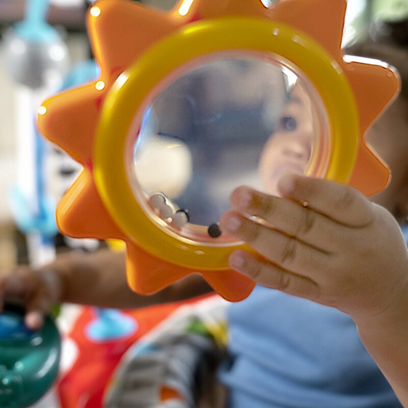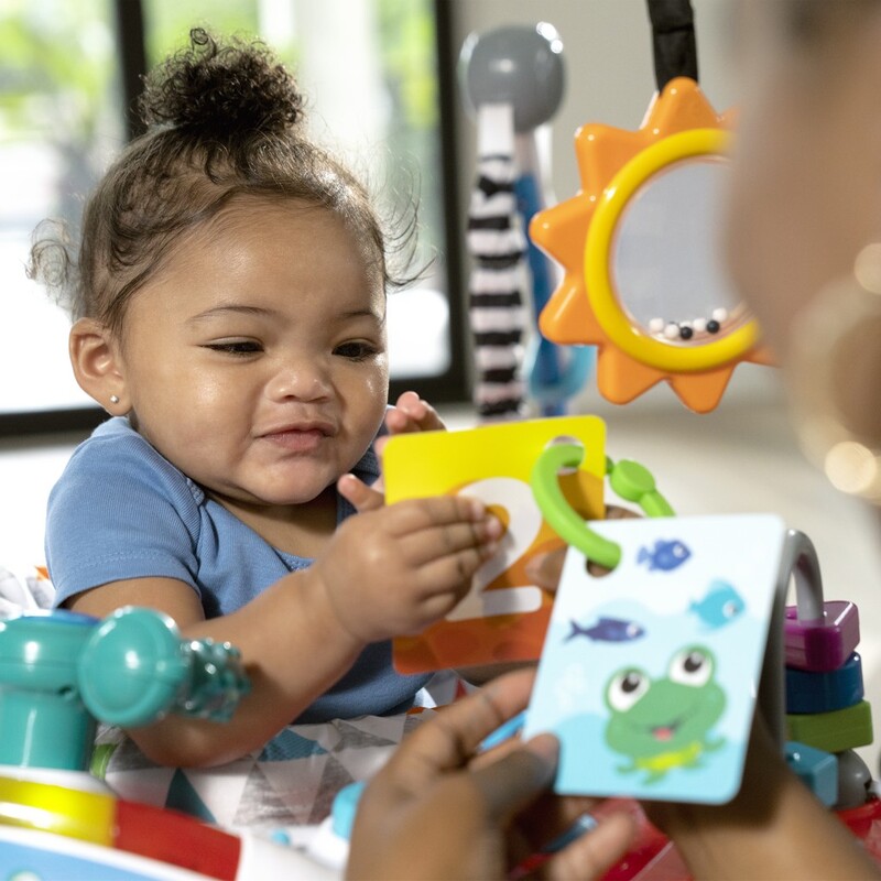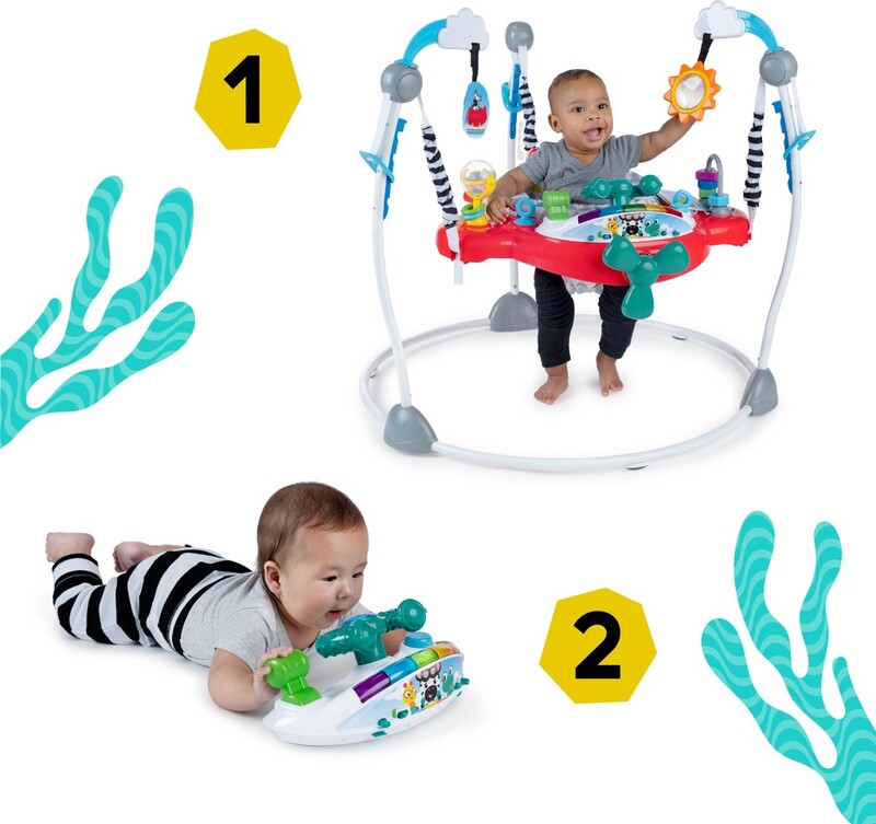 Dieťatko pri každom odraze aktivuje pesničky a svetlá, aby sa dostalo do zmyslovo stimulujúceho vzletu. Odnímateľný elektronický hrací pultík obsahuje 10 interaktívnych komponentov vrátane 7 tlačidiel, plynu a volantu, ktoré pomáhajú dieťaťu pilotovať. Dieťa sa môže učiť tvary, farby a čísla v 4 jazykoch - angličtine, španielčine, francúzštine a nemčine. 7 multisenzorických hračiek a aktivít zapája vývojové zručnosti, ako sú príčina a následok a zručnosť. Obľúbené postavičky Baby Einstein Ocean Explorers, ako Cal, Zen a Neptún, slúžia dieťaťu ako kopiloti.