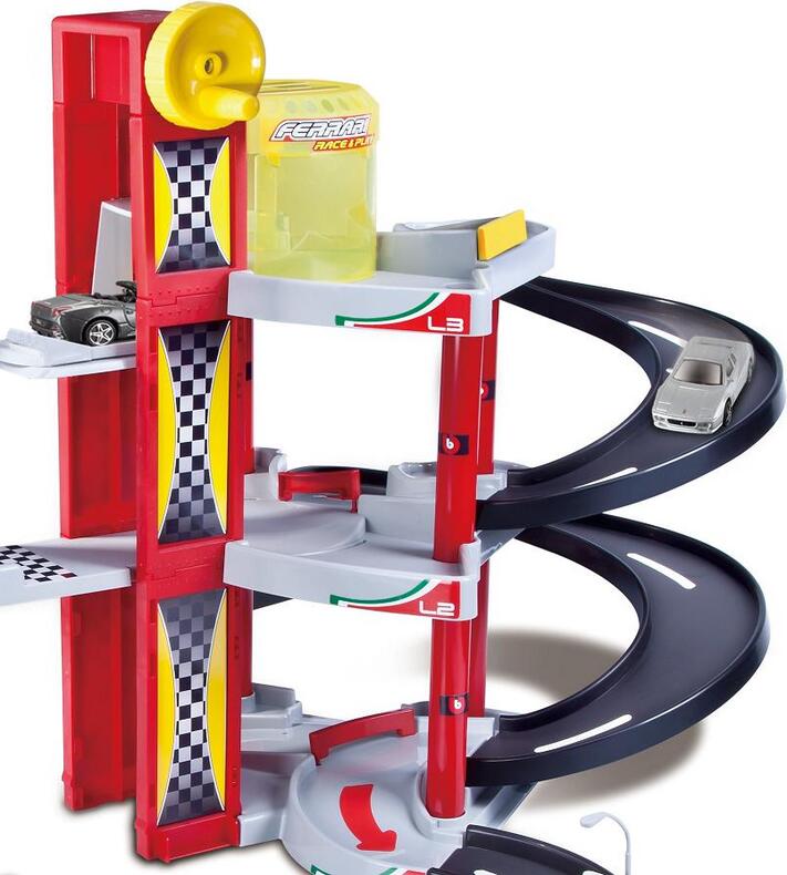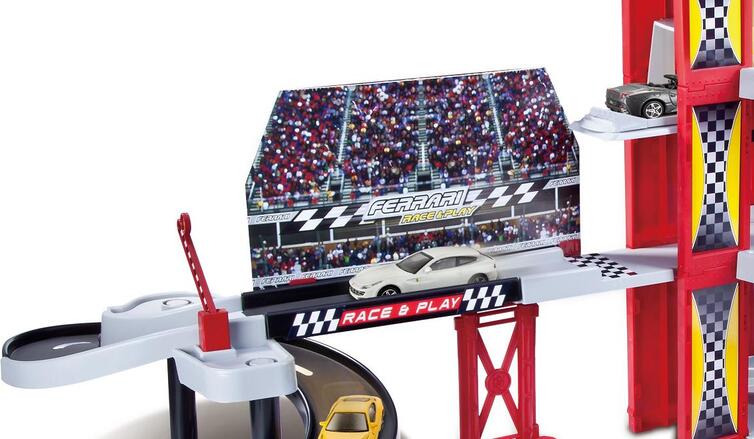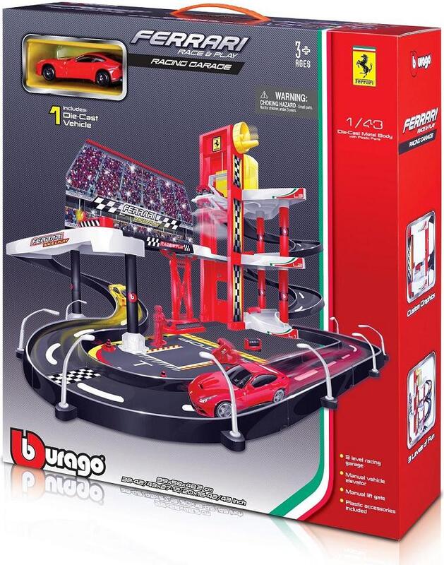 Bburago Ferrari Racing garáž s jedným autíčkom 30197, výrobca Bburago. Zaži atmosféru pretekov Ferrari! Trojpodlažná garáž: