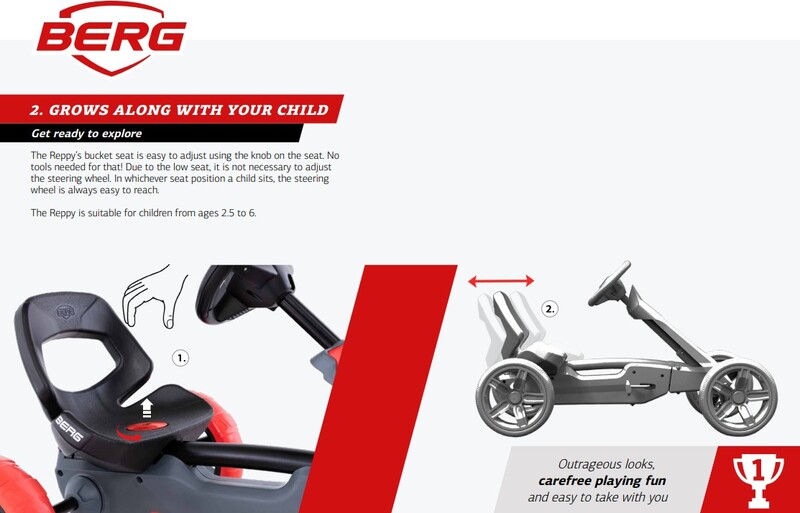 • BERG Reppy Roadster je vyrobený z pevnej ocele, stabilitu v teréne zaručuje výkyvná náprava, tichý chod zaisťujú guličkové ložiská.