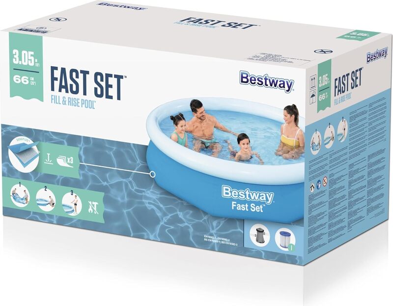 Bestway nadzemný kruhový bazén Fast Set je skvelý rodinný bazén, ktorý zostavíte v priebehu niekoľkých minút. Stačí rovná plocha, nafúknuť vrchný kruh. Telo bazéna sa zdvihne, akonáhle bazén naplníte vodou.