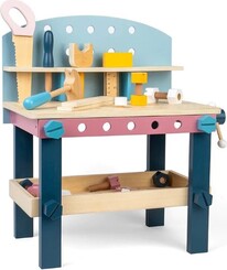 Stôl podporuje objavovanie prostredníctvom hry, rozvíja koordináciu, jemné motorické zručnosti, zručnosť malých detí a základy fungovania náradia. Je dodávaný s pílou, kľúčom, kladivkom, skrutkovačom, uholníkom a množstvom matíc a skrutiek.
