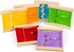 Naučte svoje dieťa, ako sa samostatne obliekať s našou sadou šiestich drevených rámčekov v pestrých farbách. Každý rámček má iné zapínanie. Deti si tak precvičujú rozopínanie a zapínanie zipsu aj suchého zipsu, povoľovanie pracky, naučia sa odopínať patentky, vyskúšajú si zaväzovanie šnúrok aj zapínanie gombíkov.