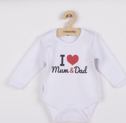 Originálne bavlnené dojčenské body s dlhým rukávom New Baby, s vtipným nápisom I love Mum and Dad. Farby použité k potlači sú certifikované a vhodné pre bábätká. Je vyrobené z príjemného a kvalitného materiálu, v ktorom sa bude Vaše bábätko cítiť príjemne. Body má zapínanie na cvočky na ramienku a medzi nožičkami, čo uľahčuje obliekanie a prebaľovanie. Doprajte Vášmu bábätku vyniknúť v originálnom body.