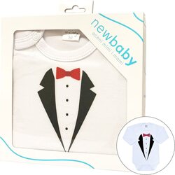 Originálne bavlnené dojčenské body s dlhým rukávom New Baby, s obrázkom smokingu. Farby použité k potlači sú certifikované a vhodné pre bábätká. Je vyrobené z príjemného a kvalitného materiálu, v ktorom sa bude Vaše bábätko cítiť príjemne. Body má zapínanie na cvočky na ramienku a medzi nožičkami, čo uľahčuje obliekanie a prebaľovanie. Doprajte Vášmu bábätku vyniknúť v originálnom body.