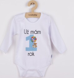 Originálne bavlnené dojčenské body s dlhým rukávom New Baby, s vtipným nápisom Už mám 1 rok a obrázkom veľkej jednotky s balónikmi.