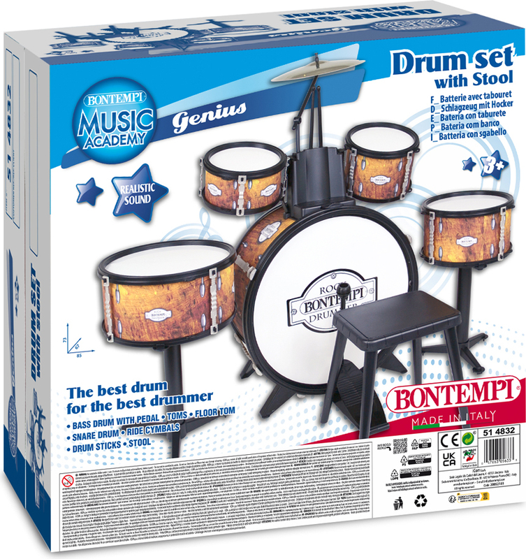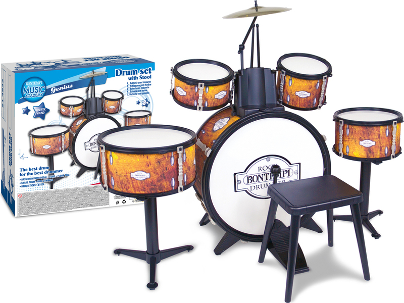 Súprava obsahuje basový bubon s pedálom (38 cm), 2 malé bubny (17 cm), 2 malé bubny na stojane (21 cm a 23 cm), dve paličky a stoličku pre pohodlné hranie.