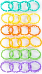 2 hrazdičky s hračkami zavesenými na C-krúžku, ktoré môžete odopnúť a vziať si na cesty alebo pripnúť na kočík alebo autosedačku.