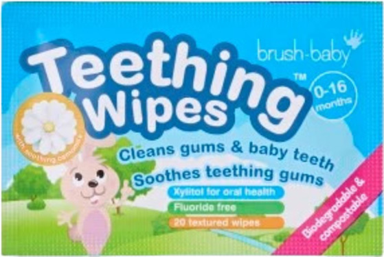 Biologicky odbúrateľné a kompostovateľné upokojujúce obrúsky na prerezávajúce sa zúbky Brush-baby Teething Wipes sú šetrné k životnému prostrediu a vhodné pre bábätká už od narodenia.