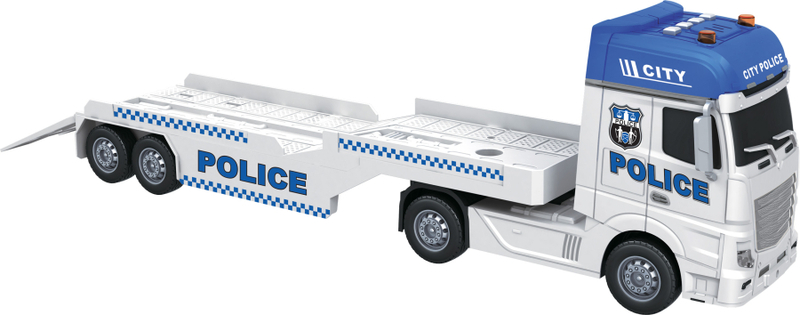 Tento policajný ťahač na prevoz vrtuľníka a osobného auta je vyrobený z vysoko kvalitného plastu s veľkým dôrazom na detail. Ťahač meria impozantných 53 cm, čo zaručuje veľkoleposť a autentickosť pri hraní. S mäkkými gumovými kolieskami a poháňaním na zotrvačník, je ťahač schopný prejsť akýkoľvek terén a ľahko preniesť vrtuľník a auto na miesto akcie.