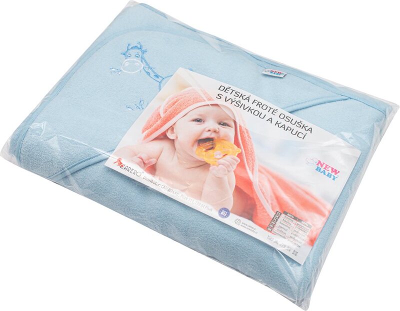Krásna detská froté osuška New Baby je vyrobená z mäkkého, kvalitného a veľmi savého materiálu a preto je ideálna pre bábätká i staršie deti. Osuška krásne zahreje po kúpeli a praktická kapucňa chráni hlavičku dieťatka pred nepríjemným chladom. Osuška dokonale absorbuje vlhkosť, pričom veľmi rýchlo schne. Zdobí ju veselý obrázok zvieratka.
