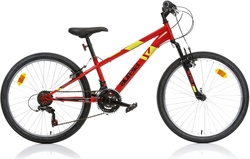 Tento energický bicykel v žiarivej červenej farbe so žltými a čiernymi prvkami je ideálny pre mladých športovcov, ktorí hľadajú výzvy. Vďaka 24" kolesám a robustnému rámu zabezpečuje spoľahlivú jazdu na rôznych povrchoch.