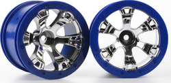 Disky kol univerzální Geode chromově lesklé s modrým ráfkem. Průměr disku 56mm (2.2"), šířka 42mm. Pro auta Traxxas 1:16 Summit. Šestihran 12mm.