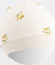 Krásna bavlnená dojčenská čiapočka New Baby Olivy. Čiapočka je vyrobená z organickej bavlny, ktorá je veľmi kvalitná, príjemná a mäkká. Je zdobená potlačou s olivkami a má širší lem, ktorý netlačí na hlavičku bábätka