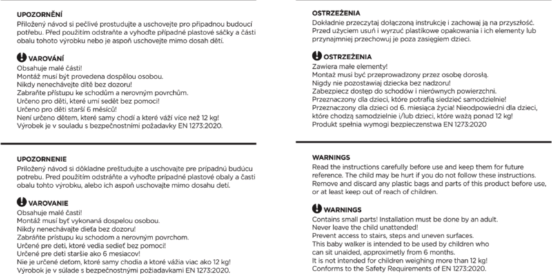 Chodítko odporúčame používať len obmedzenú dobu, maximálne 20 minút, aby bol zabezpečený zdravý vývoj dieťaťa a nedošlo k preťaženiu.