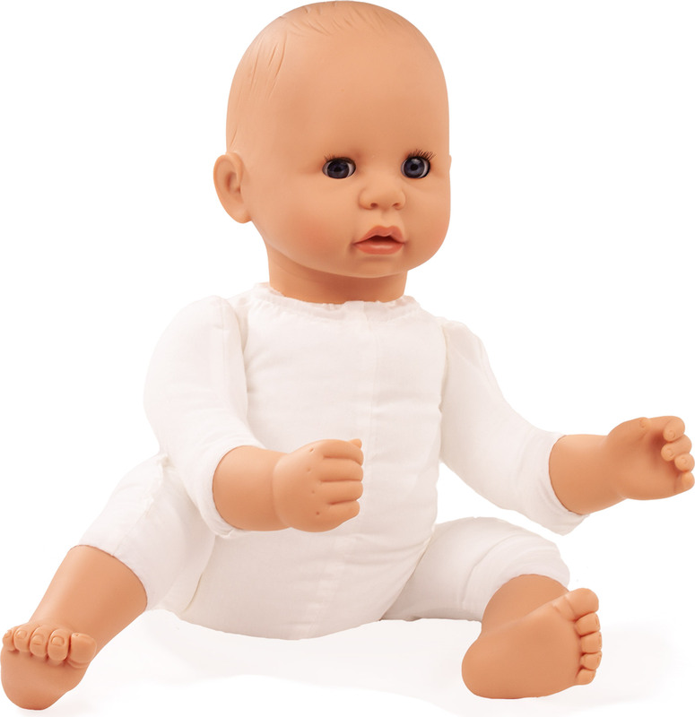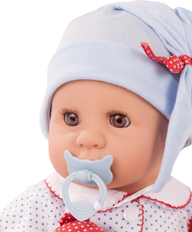Cookie sa chce celý deň hrať so svojou maminkou. Potom unavená spadne do postele, kde potrebuje už len svojho obľúbeného medvedíka a plyšovú deku. S pohľadom do jej milujúcich, veľkých, širokých jantárových očí jej maminka rada zaspí po jej boku. Malá Cookie má na sebe veselý bodkovaný overal (dupačky) s modrou špicatou čiapočkou. K tomuto outfitu patrí aj jej obľúbený medvedík a modrá plyšová deka. Súprava obsahuje: • Cookie (cca 1150 g) • Overal (dupačky) s čiapkou • Plienka • Cumeľ • Obľúbený medvedík • Plyšová deka • Možno prať v práčke a sušiť v sušičke • Mäkké telo s vinylovými rukami a nohami Vhodné pre deti od 3 rokov – kvôli veľkosti a váhe odporúčame túto bábiku pre deti od 5 rokov. UPOZORNENIE: Pred odovzdaním hračky dieťaťu odstráňte a zlikvidujte všetky šnúrky a obalový materiál. Nevhodné pre deti do 3 rokov. Obsahuje malé časti, ktoré by mohli byť prehltnuté. Riziko udusenia. Informácie o výrobcovi: Götz Puppenmanufaktur Int. GmbH Einberger Straße 113 96472 Rödental Germany Email: shop@goetz-puppen.de Telefón: +49 9563 909-75Götz bábätko Cookie v bodkovanim pyžamku s medvedíkom a dekou 48cm
