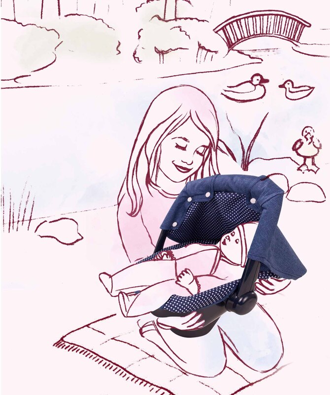S týmto nosičom bude vaša bábika úplne v súlade s trendmi. Vaša bábika bude v dobrých rukách vďaka tomuto šik denimu a veselým bodkám. Týmto spôsobom môže vaša bábika bezpečne cestovať vo vašom aute. Praktickým prvkom je aj slnečná clona. Tento cool nosič je vhodný aj na prechádzku po meste.