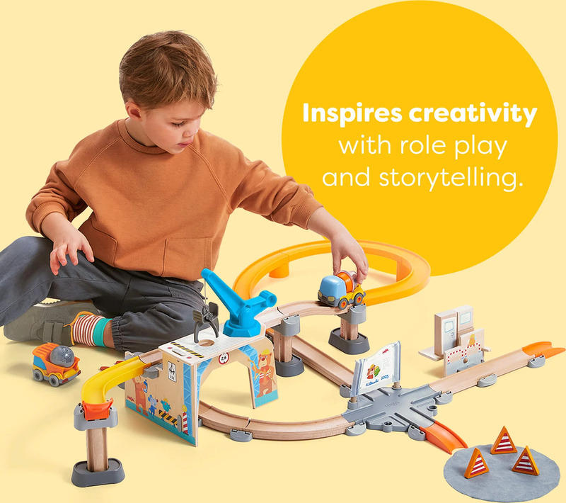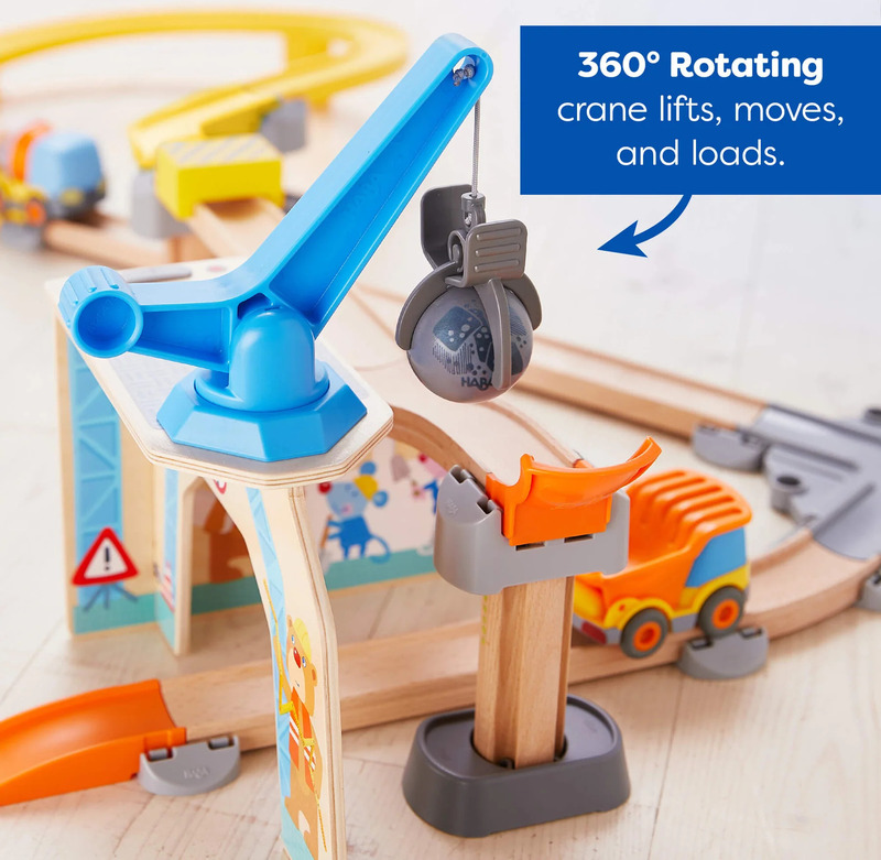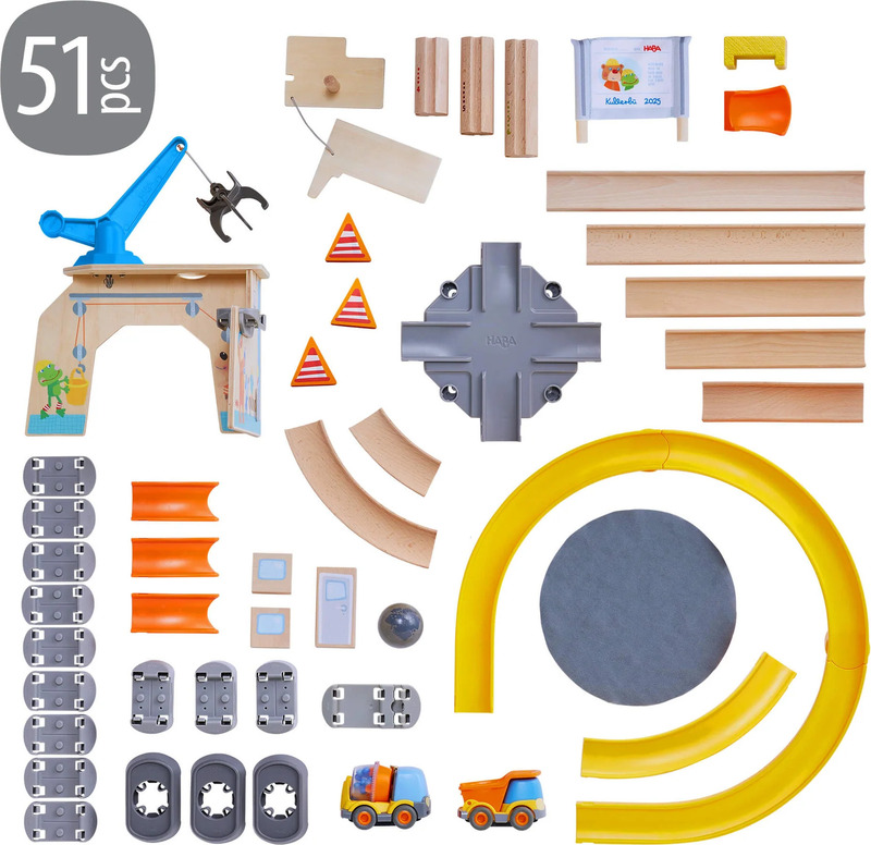 Súčasťou sady je multifunkčný 360° nákladný žeriav, dve stavebné vozidlá a mnoho ďalších dielikov, vďaka ktorým si deti môžu postaviť vlastnú jedinečnú dráhu. Po dokončení stavby sa môžu tešiť na zábavné púšťanie loptičiek po dynamických koľajniciach, ktoré podporuje koordináciu, logické myslenie a kreativitu.