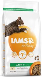 Krmivo IAMS for Vitality pre dospelé mačky a mačacie seniorov žijúce v byte je 100% kompletné a vyvážené, odborníkmi zostavené krmivo, ktoré bude vášmu zvieraťu chutiť a svedčiť. Naša nová a vylepšená receptúra s čerstvým kuracím mäsom je založená na kvalitných živočíšnych bielkovinách starostlivo vybraných tak, aby podporovali sedem znakov zdravej vitality mačky. Aby boli mačky zdravé, aktívne a plné energie, obsahujú naše lahodné receptúry až 89 % živočíšnych bielkovín (z celkového obsahu bielkovín). Naša receptúra pre mačky chované v byte dokonale prispieva k zachovaniu štíhlej a zdravej telesnej stavby. Našim záväzkom je ponúknuť mačkám špecializované krmivo so skvelou chuťou, ktoré si váš domáci maznáčik bezvýhradne zamiluje a ktoré bude podporovať všetkých sedem znakov zdravej vitality. Oproti nášmu bežnému krmivu IAMS pre dospelé mačky s čerstvým kuracím mäsom obsahuje táto receptúra o 14 % menej tuku na zachovanie štíhlej telesnej stavby a zdravej kondície. Vďaka vyváženému obsahu omega-3 a omega-6 mastných kyselín v krmive IAMS budete môcť obdivovať zdravú kožu a lesklú srsť svojho zvieraťa. Svoje receptúry sme vyvinuli tak, aby znižovali pH v močovej sústave a udržali ju zdravú. Pripravte sa, že vaša mačka bude skákať a vyčíňať. To vďaka kvalitným bielkovinám a nevyhnutným minerálom, ktoré pomáhajú udržať zdravé svaly a kosti. Kombinácia antioxidantov s vitamínom E posilňuje imunitu, takže ju už pri výpravách nič neohrozí. A keď ju budete počuť chrúmať naše granule s vyváženým obsahom minerálov v každom súste, môžete si byť istí, že bude mať silné a zdravé zuby. Pri upratovaní mačacej toalety oceníte zdravé trávenie mačky vďaka optimálnej kombinácii vlákniny, prebiotík a repnej dužiny. Naše krmivá navyše obsahujú základné živiny, ako napr. taurín, pre zdravé srdce, aby vám váš miláčik nikdy neprestal prejavovať lásku. Krmivo IAMS podporuje sedem znakov zdravej vitality, ktoré na svojom zvierati budete s radosťou pozorovať každý deň. Kŕmny návod: viď tabuľka na obale. Zloženie: sušené kuracie a morčacie 43% (kuracie 26%, prirodzený zdroj taurínu), kukurica, cirok, sušená repná dužina (4,6%), prášková celulóza (4,6%), čerstvé kuracie (4,1%), bravčový tuk, kuracia šťava, fruktooligosacharidy (0,69 %), chlorid draselný, rybí tuk, sušené pivovarské kvasnice. Akostné znaky: hrubé proteíny 36,5 %, hrubé oleje a tuky 12 %, omega-6 mastné kyseliny 2,4 %, omega-3 mastné kyseliny 0,27 %, hrubé popoloviny 7,3 %, hrubá vláknina 6,1 % , vápnik 1,4%, fosfor 1,1%, horčík 0,093%, taurín 2000 mg / kg.