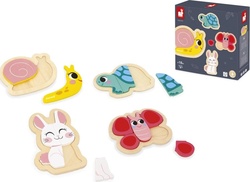 Táto pekná darčeková krabička obsahuje 4 vkladacie puzzle rôznych obťiažností na tému záhradných zvieratiek: 2-dielny slimák, 3-dielna korytnačka, 4-dielny zajac a 5-dielny motýľ.