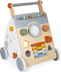 Okrem chôdze bude vaše dieťa môcť vyskúšať svoju jemnú motoriku a šikovnosť pomocou 9 ponúkaných zábavných aktivít: drôtená dráha - slučkovací hlavolam, vkladanie tvarov, bludisko, ozubené kolesá, gombík na húkanie, škrabkanie, zväčšujúce sa rotujúce zrkadlo, bubon a kovový xylofón stimulujú hudobné povedomie.
