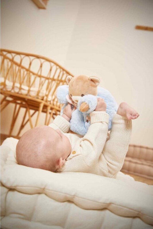 Tento modrý plyšový medvedík Patapouf sa dá prať v práčke pri teplote 30 °C.