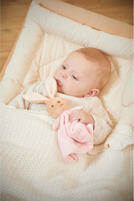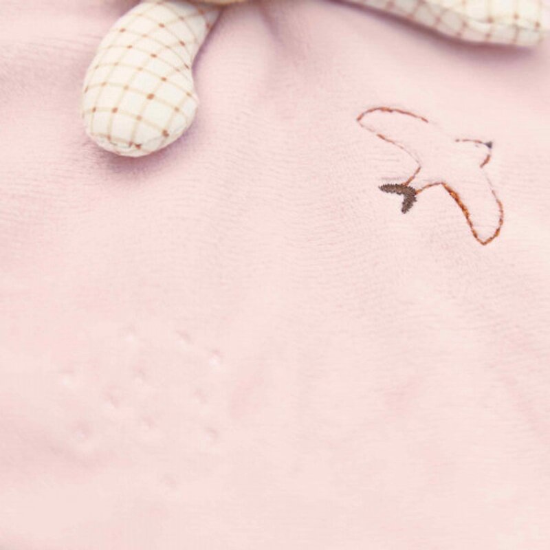 Objavte ružového okrúhleho mojkáčika v podobe zajačika, mäkkého a upokojujúceho spoločníka pre vaše dieťa od narodenia.