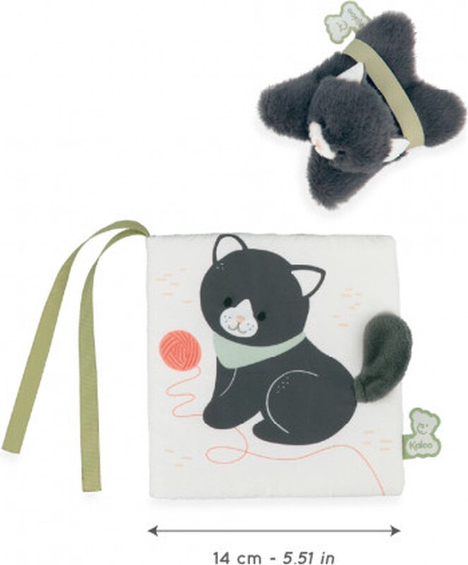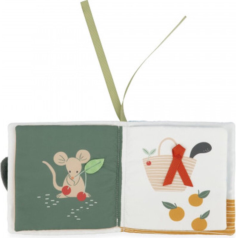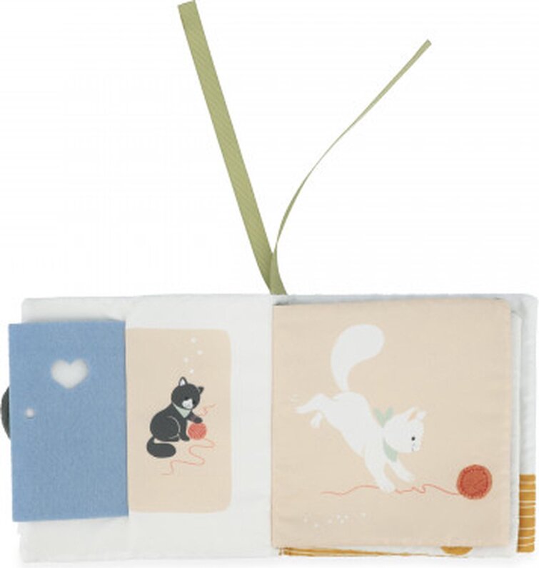 Táto látková knižka s rozmerom 14 cm je vyrobená z poplínu, mikrovelúru, plsti a umelej kožušiny, čo je ideálne pre stimuláciu bábätka.