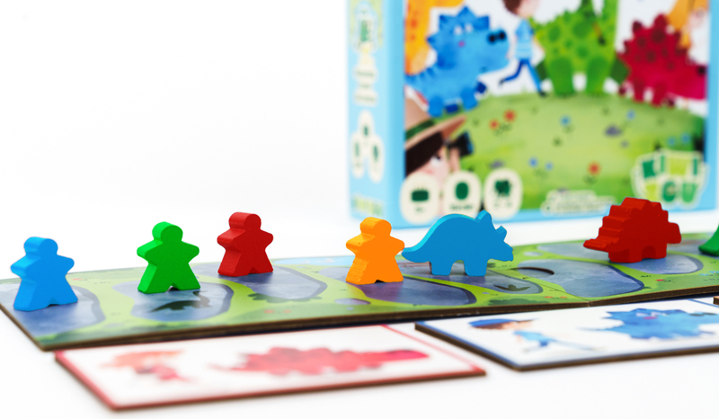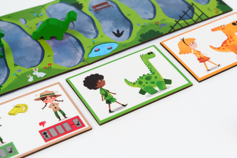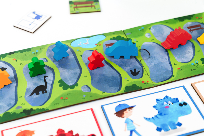 Obsah balenia: herný plán Dino Park, 4 karty Duo Dino / Majster, 1 karta Billy, opatrovateľka, 6 kariet Lavice, 4 figúrky Majster, 4 figúrky Dino, drevená kocka