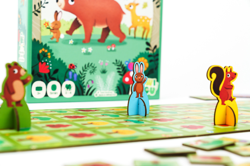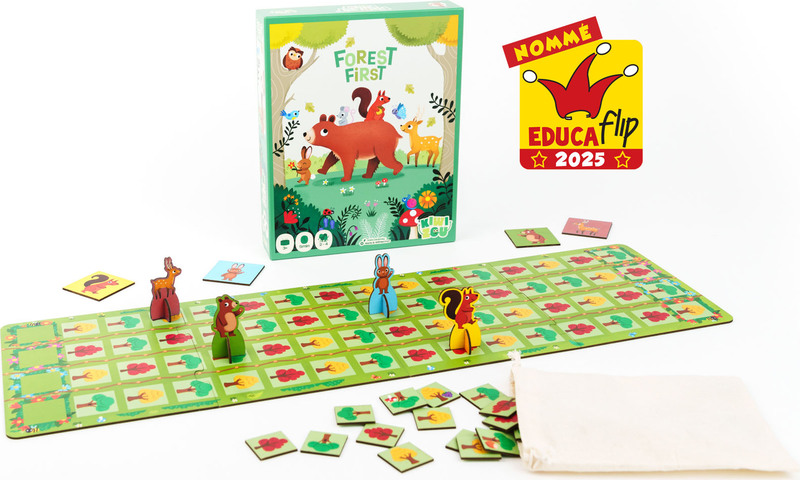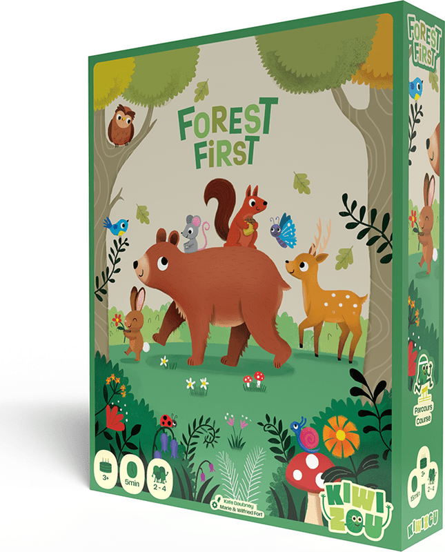 Forest First je rýchla a hravá závodná hra, v ktorej sa lesné zvieratká snažia dostať k cieľu ako prvé. Všetci hrajú súčasne, namiesto hádzania kockou žrebujú žetón z vrecka. Ten určí, na ktoré políčko sa všetci posunú. Pokiaľ sa objaví žetón s jedlom, zvieratká sa zastavia na desiatu, čo hru spomalí. Hra rozvíja vnímanie farieb, rýchle reakcie a súťaživosť vo veselom tempe. Hra je určená pre 2 až 4 hráčov od 3 rokov a zaberie približne 5 minút, čo je ideálna dĺžka pre malých hráčov.
