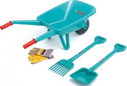 Záhradné set značky Bosch obsahuje hrabličky, lopatku, pracovné rukavice a fúrik.