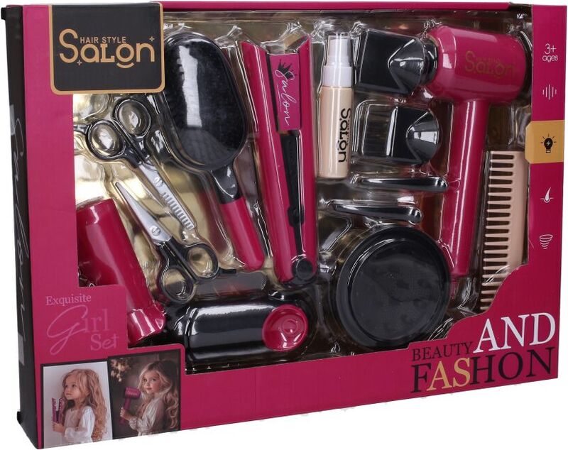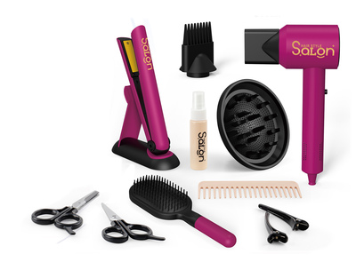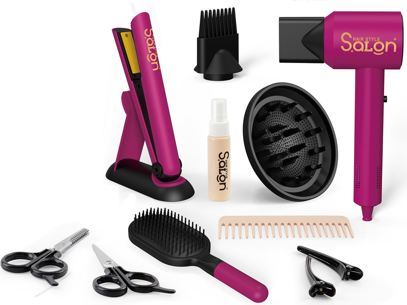Obsahuje fén, žehličku, kefu, hrebeň, 2x nožnice, 2x sponky, sprej, nástavce.