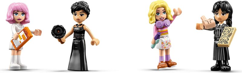 Vitajte späť v Nevermore Academy s tajomnou a dobrodružnou stavebnicou LEGO® Wednesday: Izba Wednesday a Enid (76781) pre deti a fanúšikov od 10 rokov. Prepracovaná darčeková stavebnica LEGO® Wednesday Addamsová obsahuje 4 zberateľské minibábiky Wednesday a Enid, postavičku Veci a model ich internátnej izby. V izbe nájdete violončelo, písací stroj, tajomnú nástenku, balkón s chrličmi, otváracie okno, podstavec s tlačidlami na otvorenie skrytých zásuviek a ďalšie. Do zásuviek môžete uložiť 2 minifigúrky bábiky spolu s doplnkami vrátane čelenky s mačacími ušami a telefónu Enid.