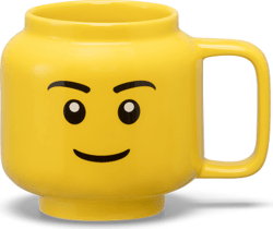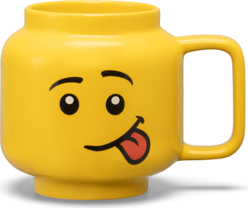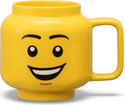 Tento žltý keramický hrnček má podobu klasickej hlavy minifigúrky s veselou potlačou tváre.
