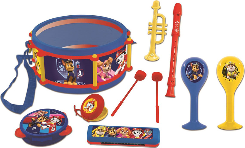 Táto sedemdielna hudobná sada je skvelým začiatkom pre tých najmenších pri zoznamovaní sa s rytmami a hudbou. Sada obsahuje buben, kastanety, harmoniku, flautu, trúbku, pár marakás (rumba gule), malú tamburínu a dve paličky. Všetky nástroje možno bezpečne uložiť do veľkého bubna s vekom pre jednoduché skladovanie a prepravu, čo oceníte pri cestovaní alebo prenášaní. Deti si užijú veľa zábavy, ktorá zároveň prispieva k rozvoju koordinácie pohybov a cvičeniu sluchového vnímania.