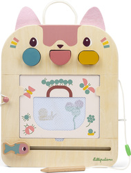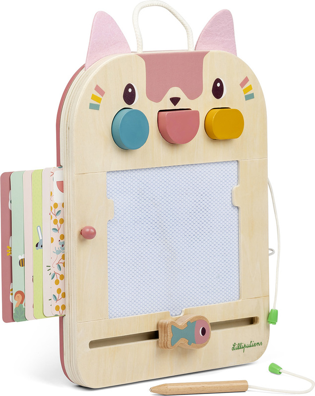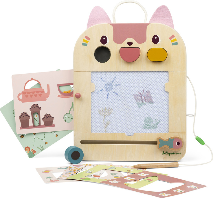 Magická tabuľka mačičky Jeanne ponúka deťom od 18 mesiacov nekonečné možnosti kreslenia a hrania. Rôzne farby, 3 razítka s geometrickými tvarmi, 6 obojstranných kariet s aktivitami a drevená tužka. To všetko stimuluje malé ručičky a rozvíja jemnú motoriku a zmyslové vnímanie. Nelíči sa deťom obrázok? Túži namaľovať iný? Žiadny problém, Jeannina kamarátka rybička obrázok vymaže a môžete maľovať znova. Herné karty sú uložené vzadu a drevená tužka je pripevnená k tabuľke špagátom, takže nehrozí, že by sa stratila.