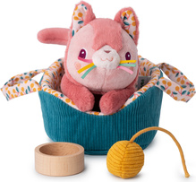 Mačiatko má oblečok, misku na papanie a klbko vlny na hranie. Tento útulný košík s hebkým mačiatkom je dokonalá hračka pre deti od 12 mesiacov, ktoré sa rady starajú o svojich miláčikov.